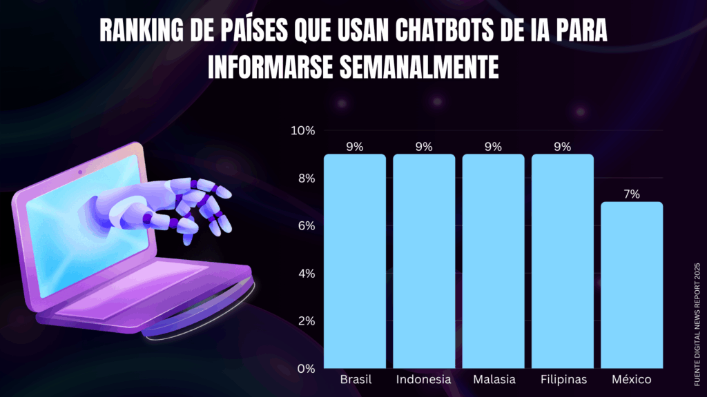 Cabe destacar que el impacto de la IA no se agota en el entorno laboral. El Digital News Report 2025, elaborado por el Instituto Reuters, muestra que un 7% de los mexicanos utiliza semanalmente chatbots de inteligencia artificial como fuente principal de noticias, superando en este aspecto a países como Japón, Alemania o el Reino Unido. Herramientas como ChatGPT o Gemini se integran cada vez más en buscadores y redes sociales, particularmente entre los usuarios más jóvenes.