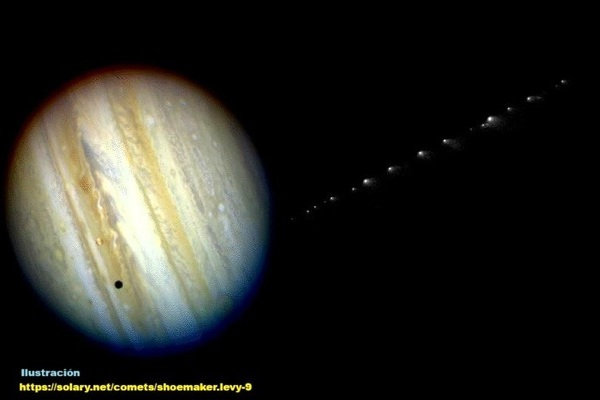 El cometa estaba girando alrededor de Júpiter y no del Sol, con un periodo de aproximadamente 2 años, quizá atrapado por la gravedad del planeta entre 1960 y 1970. El Shoemaker- Levy 9 debió acercarse a Júpiter el 7 de julio de 1992 a sólo 40 mil km por encima de las nubes del planeta, lo que seguramente lo fragmentó en más de 23 segmentos, nombrados alfabéticamente.