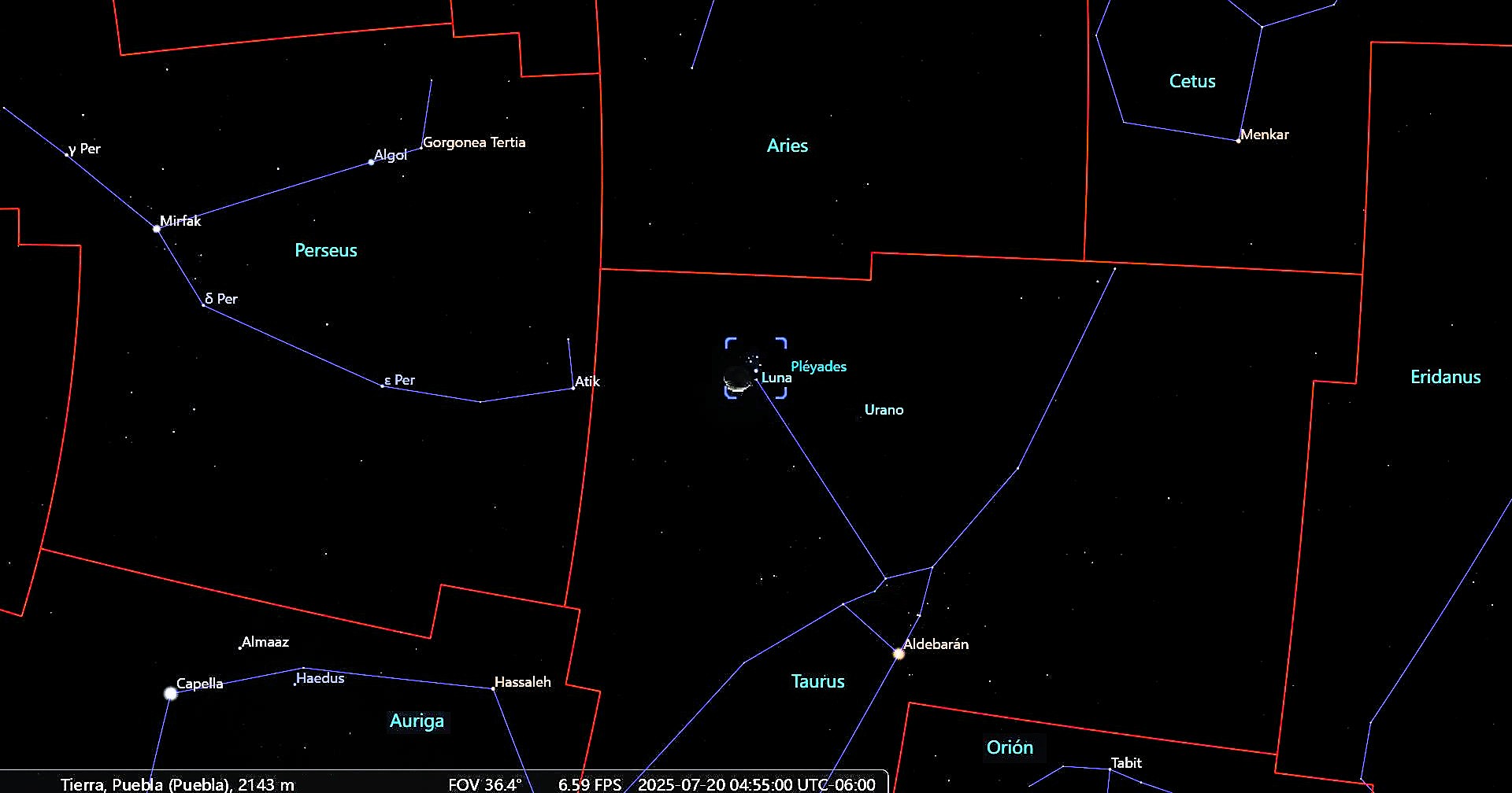 Así, el 20 de julio a las 4:55 hora del Centro de México, la Luna estará pasando a solo 0° 46’ (46 minutos de arco) de M45, en dirección de la constelación de Tauro. Será observable al amanecer, sin necesidad de emplear instrumentos ópticos adicionales.
