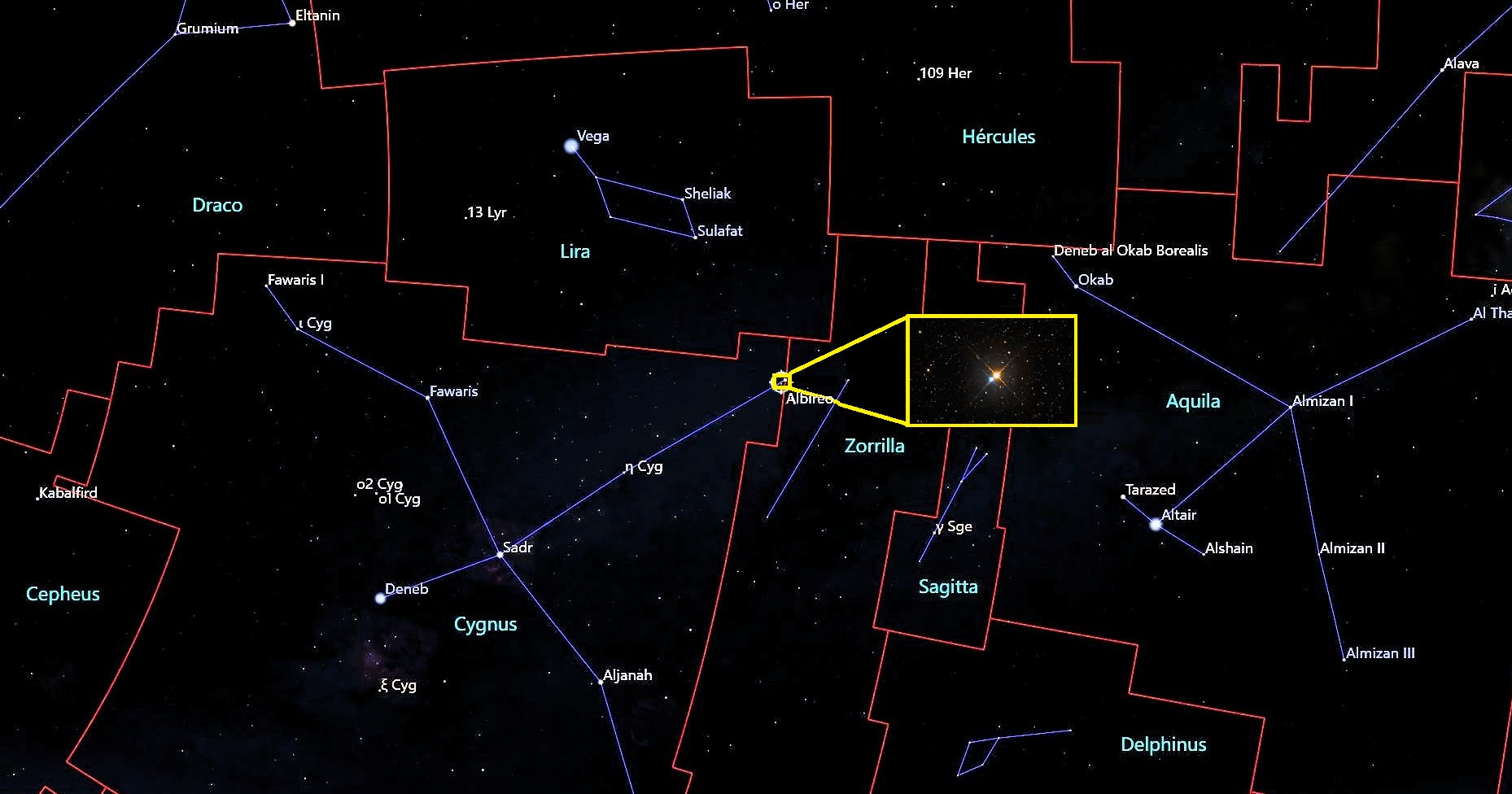 Albireo es una estrella doble, compuesta por β1 Cyg (Albireo), de color amarillento, con magnitud 3.3, y β2 Cyg de color azulado, con magnitud 5.1, estarán bien ubicadas para su observación la mayor parte de la noche, en la constelación del Cisne, hacia el noreste de la esfera celeste. Unos binoculares o un telescopio pequeño, serán suficientes para observar este par de llamativas estrellas.