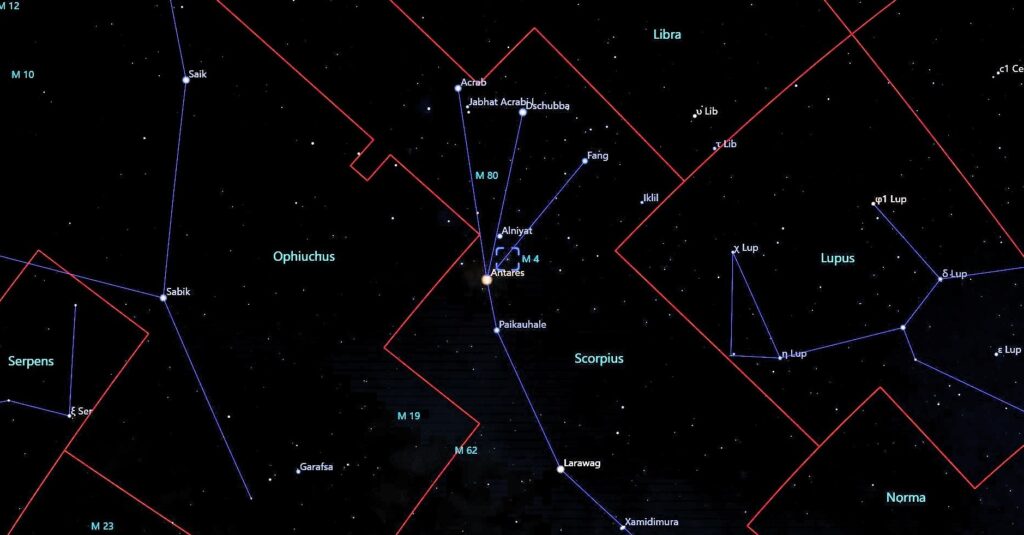 Muy cerca de Antares, podemos localizar al objeto Messier M4, NGC 6121, o Cúmulo Globular del Cangrejo. Estos cúmulos globulares son conjuntos esféricos de estrellas que interactúan gravitacionalmente entre ellas; se encuentran en los halos de las galaxias y se estima que son muy antiguos. M4 fue descubierto por De Chéseaux entre 1745-46; pero fue hasta 1764 cuando Messier lo integró a su famoso catalogó, el número 4.