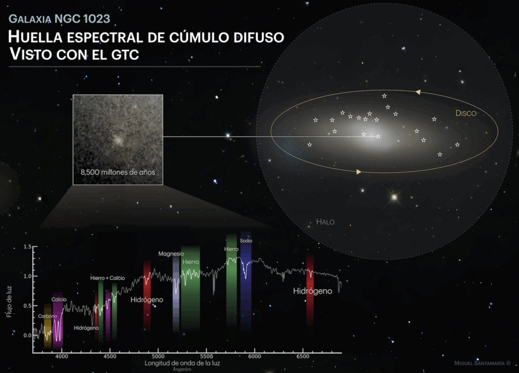 En entrevista, Miguel López Santamaría explica que con su gran tamaño y capacidad de observar múltiples objetos a la vez, el GTC ofrece precisamente esta posibilidad. Las claves para descifrar el enigma fue la medición de la velocidad radial y las huellas químicas de la luz de estos objetos. Los cúmulos pertenecientes a NGC 1023 comparten una cinemática distinta al movimiento de las galaxias del fondo. “Los espectros de los cúmulos genuinos presentan una huella química típica de estrellas viejas, mientras que los objetos nebulosos y las galaxias lejanas exhiben líneas de emisión características de gas ionizado”, subraya.
