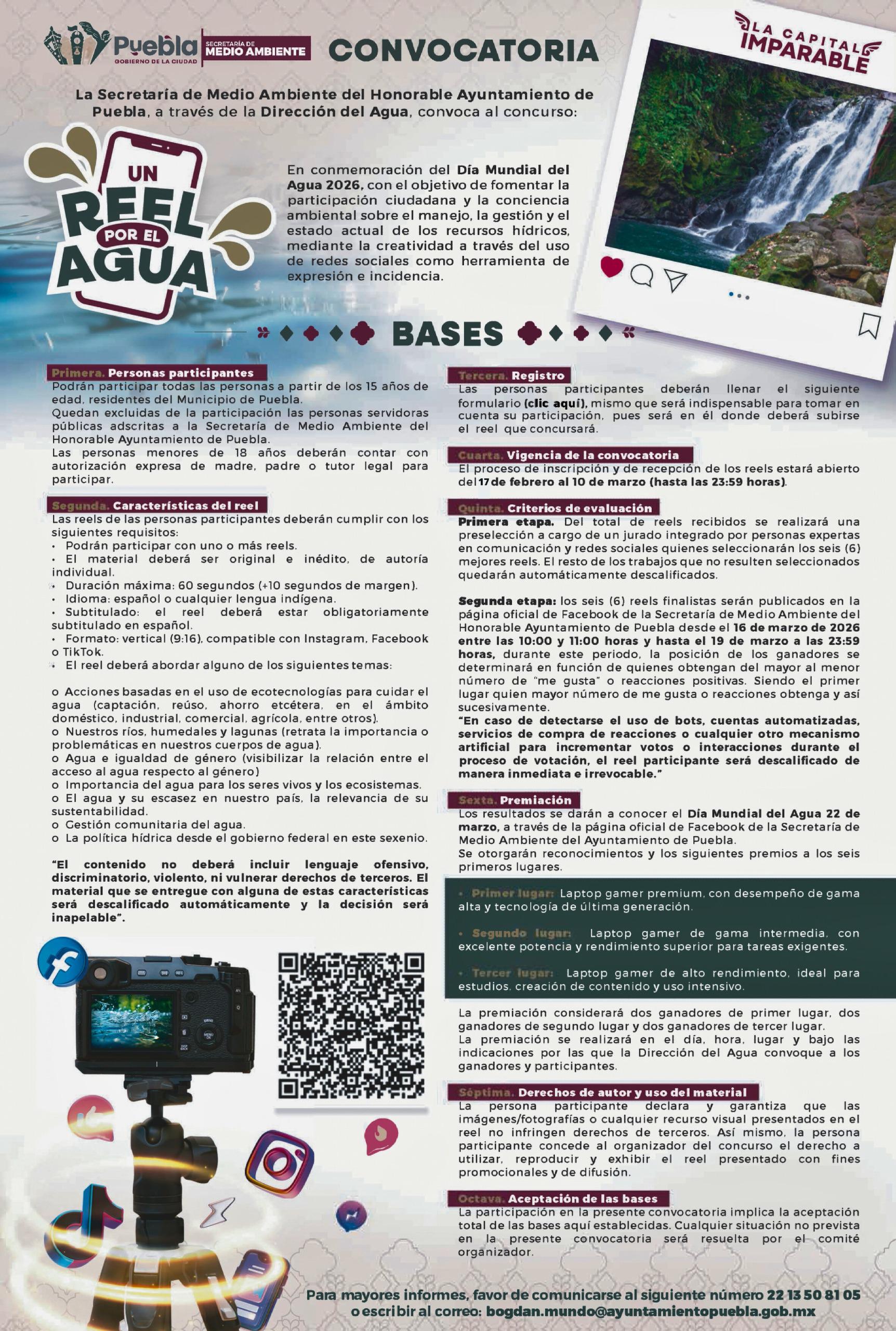 Para mayores informes, la ciudadanía se pude comunicar al teléfono 22 13 50 81 05 o al correo electrónico bogdan.mundo@ayuntamientopuebla.gob.mx. Consulta las bases completas en el siguiente enlace oficial: