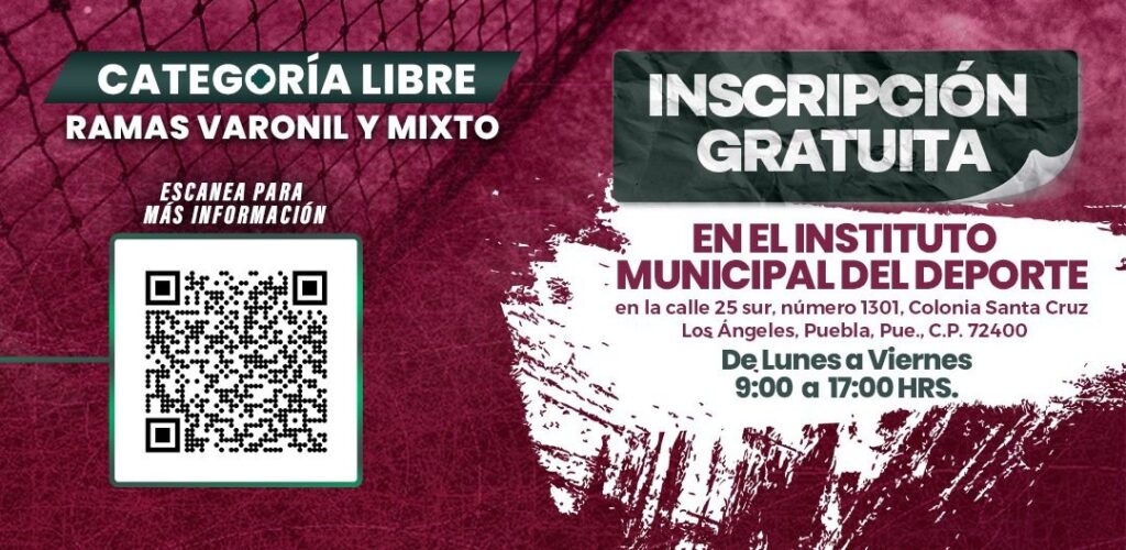 La inscripción es gratuita y el periodo de registro inicia inmediatamente tras la publicación de esta convocatoria y concluye estrictamente el 25 de noviembre de 2025, sin posibilidad de prórroga, asimismo se llevarán a cabo en las instalaciones del IMDP, de lunes a viernes, en horario de 09:00 a 17:00 horas. Es indispensable que los equipos obtengan los formatos de inscripción a través del código QR correspondiente y los presenten debidamente requisitados para su sellado oficial.