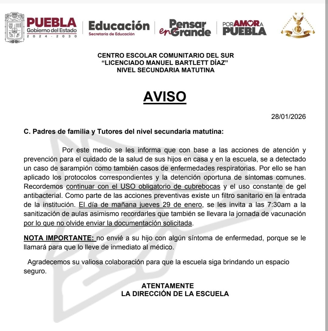 Debido a que se detectó un caso de sarampión en el Centro Escolar del Sur «Manuel Bartlett Díaz» de la ciudad de Puebla, se ordenó el uso obligatorio de cubrebocas, además de gel antibacterial.