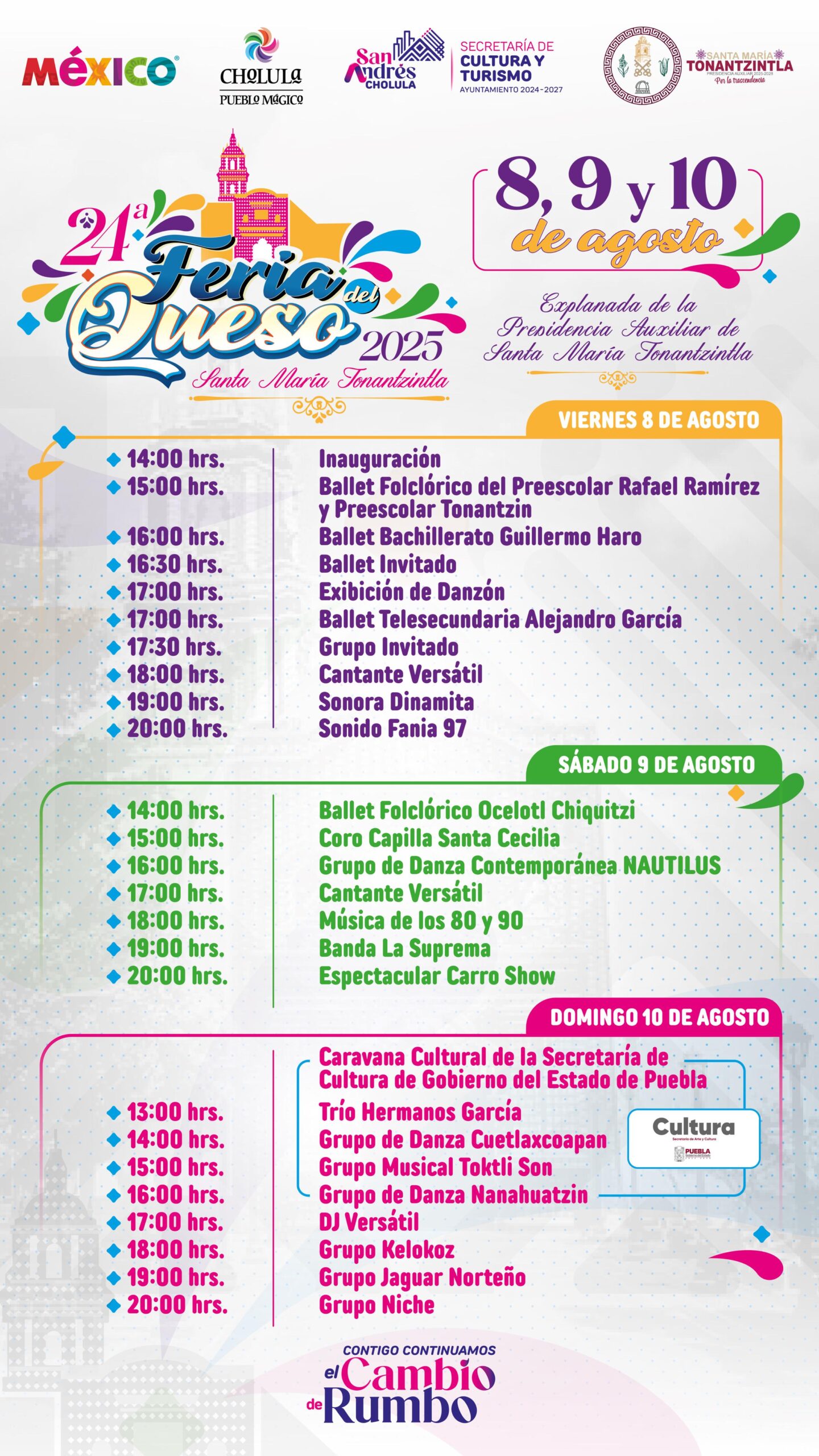 Por su parte, Eva María Toxqui Daniel, secretaria de Cultura y Turismo, dio a conocer el programa de actividades culturales y artísticas, resaltando una cartelera diversa para toda la familia. El 8 de agosto se llevará a cabo la inauguración oficial a las 14:00 horas, seguida de la presentación estelar del grupo de música tropical la Sonora Dinamita a las 19:00 horas y del Sonido Fania 97 a las 20:00 horas. Para el 9 de agosto, el programa contempla la participación del Ballet Folclórico Ocelotl Chiquitzi a las 14:00 horas, el Coro Capilla Santa Cecilia a las 15:00 horas, cerrando con la Banda La Suprema a las 19:00 horas.