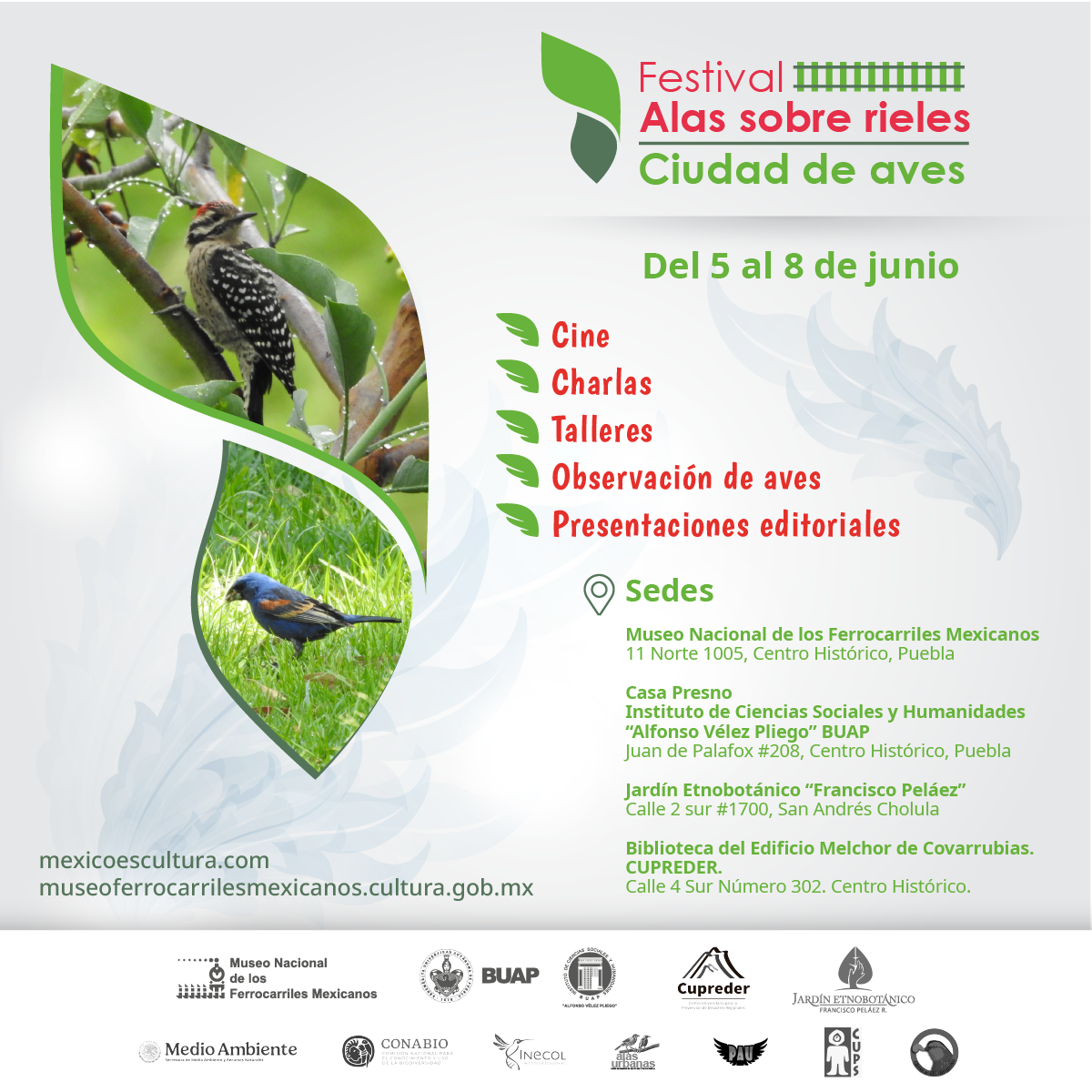 El Museo Nacional de los Ferrocarriles Mexicanos (MNFM), la BUAP, a través del Cuerpo Académico 330 “Prevención de la violencia: educando para una cultura de paz a través de la participación social” del Instituto de Ciencias Sociales y Humanidades “Alfonso Vélez Pliego” y del Centro Universitario para la Prevención de Desastres Regionales (CUPREDER); el Jardín Etnobotánico Francisco Peláez Roldán y el club de observadores de aves del estado de Puebla: Alas Urbanas; invitan al público a explorar la riqueza de la avifauna urbana y el medio ambiente a través de una serie de actividades educativas y culturales, del 5 al 8 de junio de 2025, en el Festival Alas Sobre Rieles.