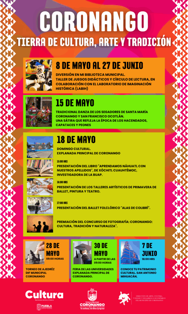 De la mano del gobierno de Alejandro Armenta, el Ayuntamiento de Coronango anunció la primera cartelera cultural de impacto estatal, misma que se alista para los meses de mayo y junio y contempla una serie de actividades gratuitas.