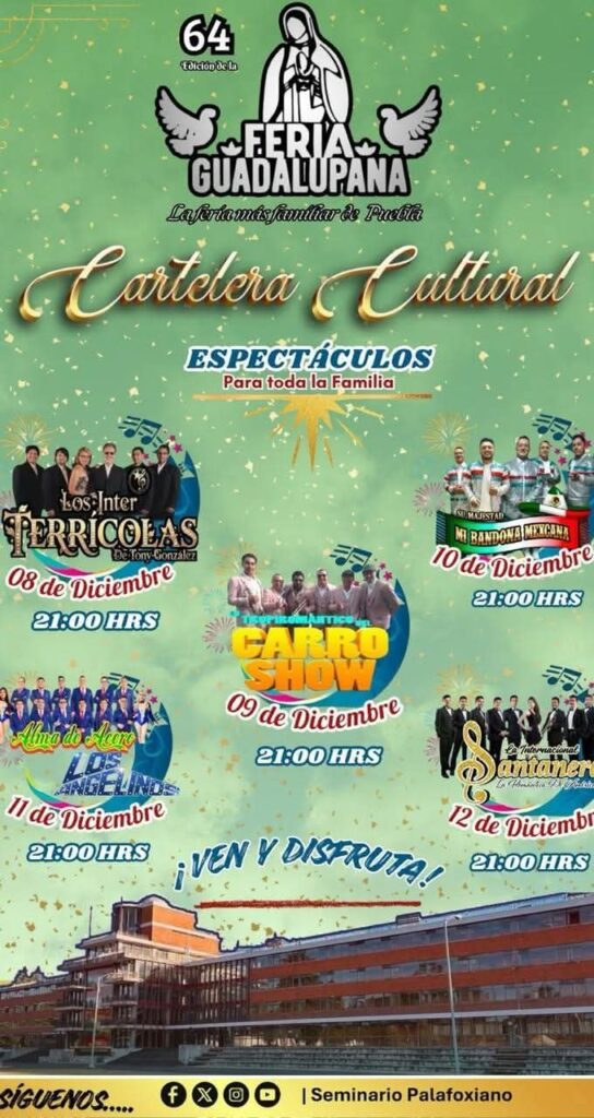 Del 08 al 12 de diciembre 2025 se llevará a cabo la 64º Feria Guadalupana, “la feria más familiar de Puebla”, en las instalaciones del Seminario Mayor Palafoxiano. Esta feria tiene como objetivos: