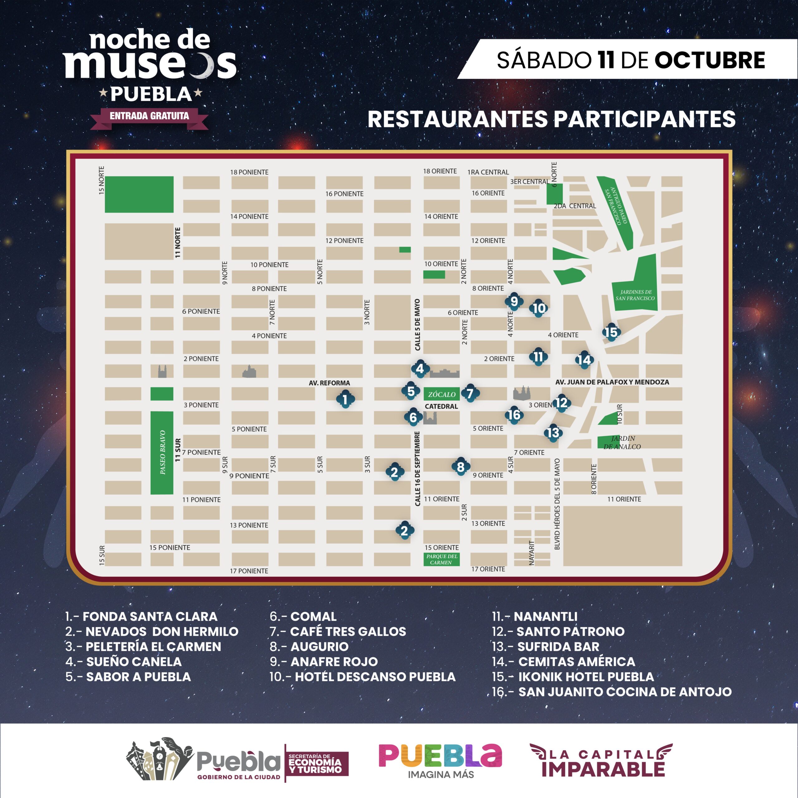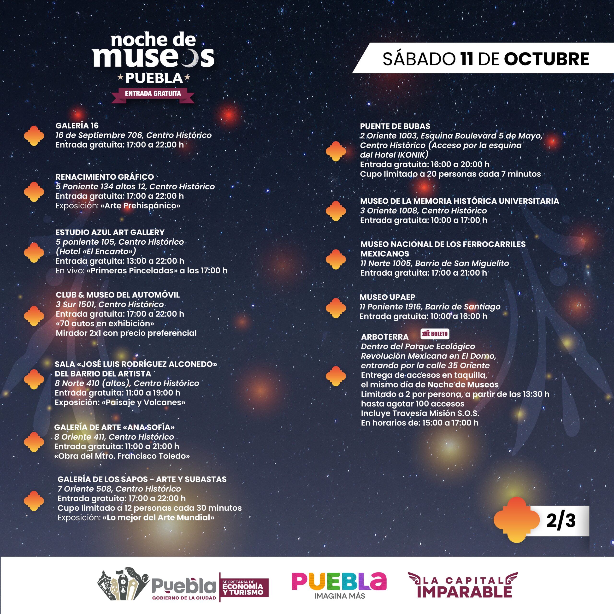 En Arboterra, uno de los recintos participantes, el secretario destacó que esta es la invitación calendarizada para este mes, del programa Noche de Museos, que tendrá 28 sedes, en la ciudad de Puebla, pero también en la junta auxiliar Ignacio Romero Vargas, y los municipios de San Pedro Cholula, Tecali de Herrera, Libres, Teziutlán y Zacatlán.