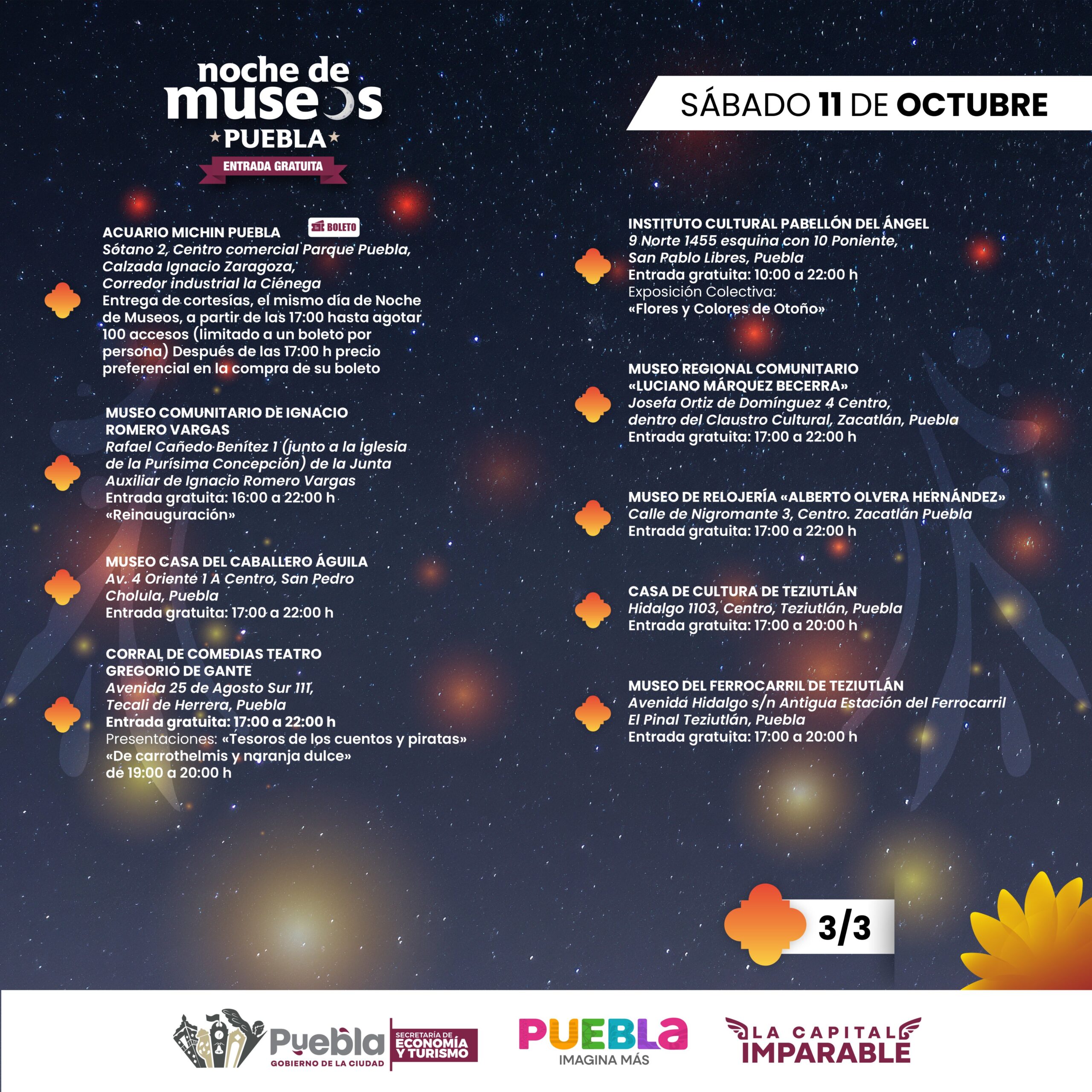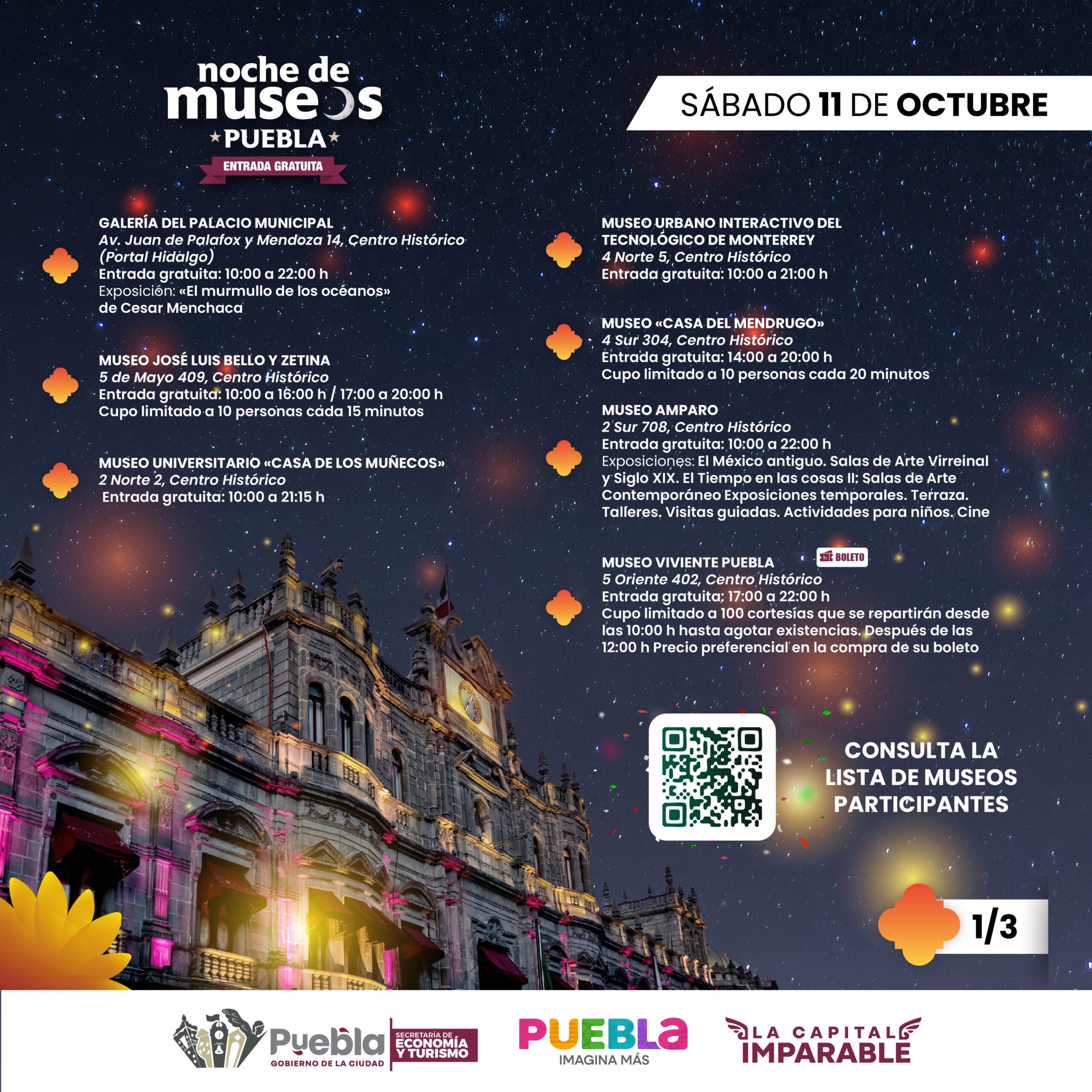Oropeza Casas recomendó visitar las redes sociales de Noche de Museos y Visita Puebla, en Facebook y X, para conocer los detalles de acceso de los 28 recintos culturales.