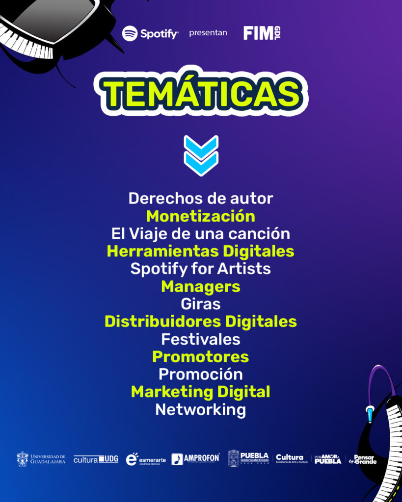Durante la jornada, se llevarán a cabo charlas, clínicas, talleres y encuentros de vinculación sobre temas como derechos de autor, monetización, herramientas digitales, giras, distribuidores, festivales, mercadotecnia, promoción, entre otros, con el objetivo de consolidar un espacio de intercambio que dé visibilidad al talento poblano y fomente nuevas formas de colaboración dentro de la industria musical.