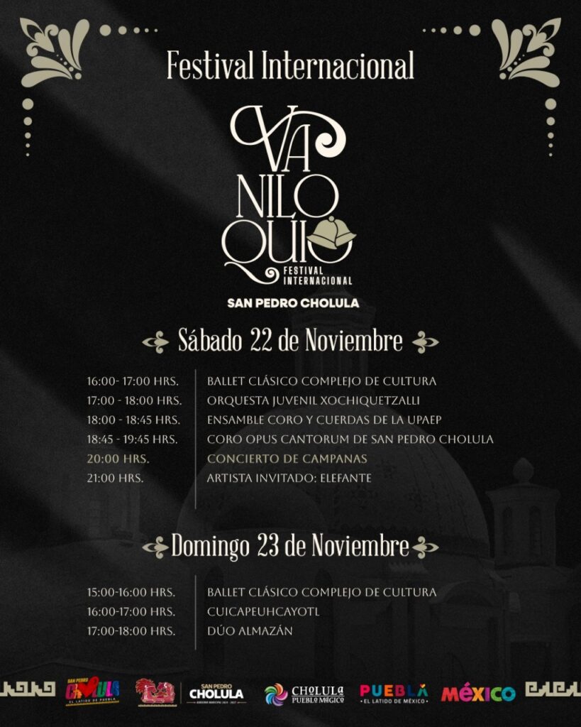 En esta edición del festival Vaniloquio 2025 participarán 14 iglesias de San Pedro Cholula. El programa inicia a las 16:00 horas con actividades culturales y continuará a las 20:00 horas con el concierto de campanas. Al finalizar, se ofrecerá un espectáculo musical gratuito que fortalece la convivencia familiar y la actividad económica local. Los templos que integrarán el concierto son:
