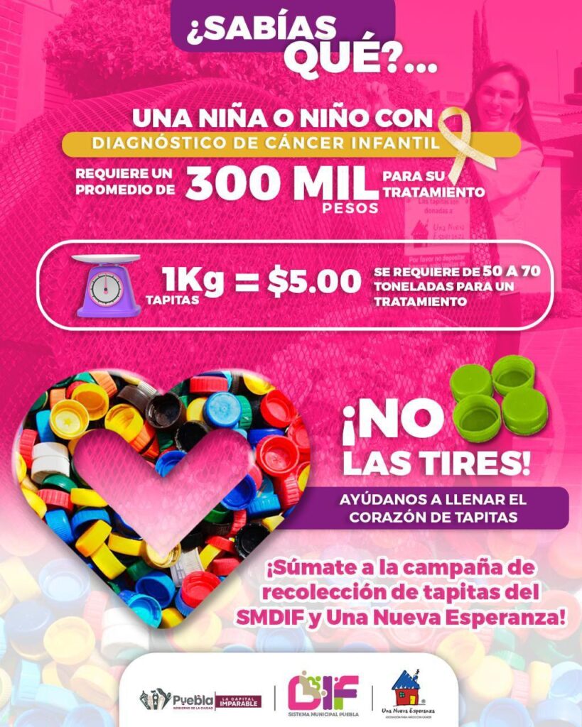 Esta acción forma parte de la campaña permanente del SMDIF y el convenio que tiene con la fundación “Una Nueva Esperanza”, que busca recolectar tapitas de plástico con fines solidarios, ya que los recursos obtenidos por su reciclaje se destinan a cubrir tratamientos oncológicos pediátricos.