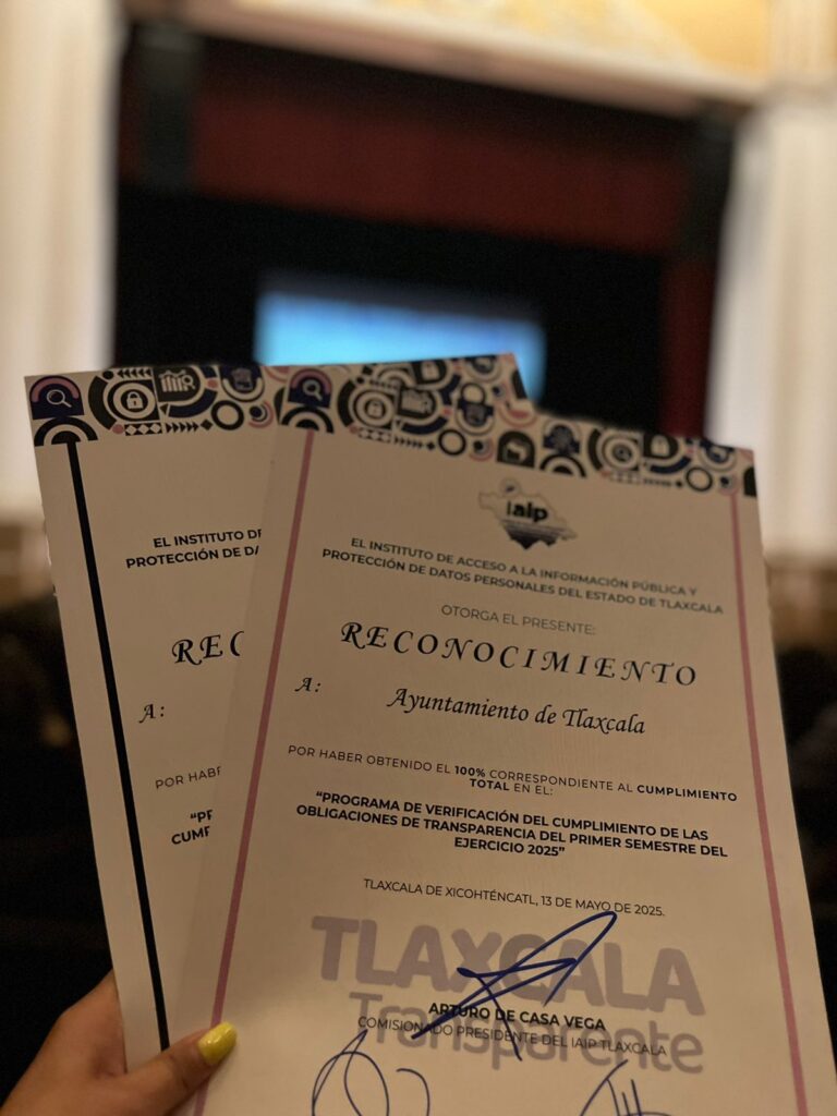 El Ayuntamiento de Tlaxcala y la Comisión de Agua Potable y Alcantarillado del Municipio (CAPAM) fueron reconocidos por el Instituto de Acceso a la Información Pública (IAIP) del estado de Tlaxcala por cumplir al 100% con sus obligaciones de transparencia, así como con la verificación de avisos de privacidad y la protección de datos personales, refrendando así el compromiso de esta administración con la rendición de cuentas y el acceso a la información pública.