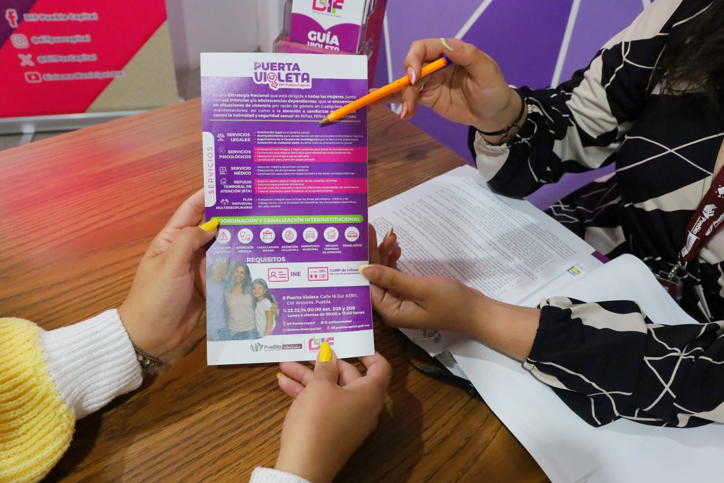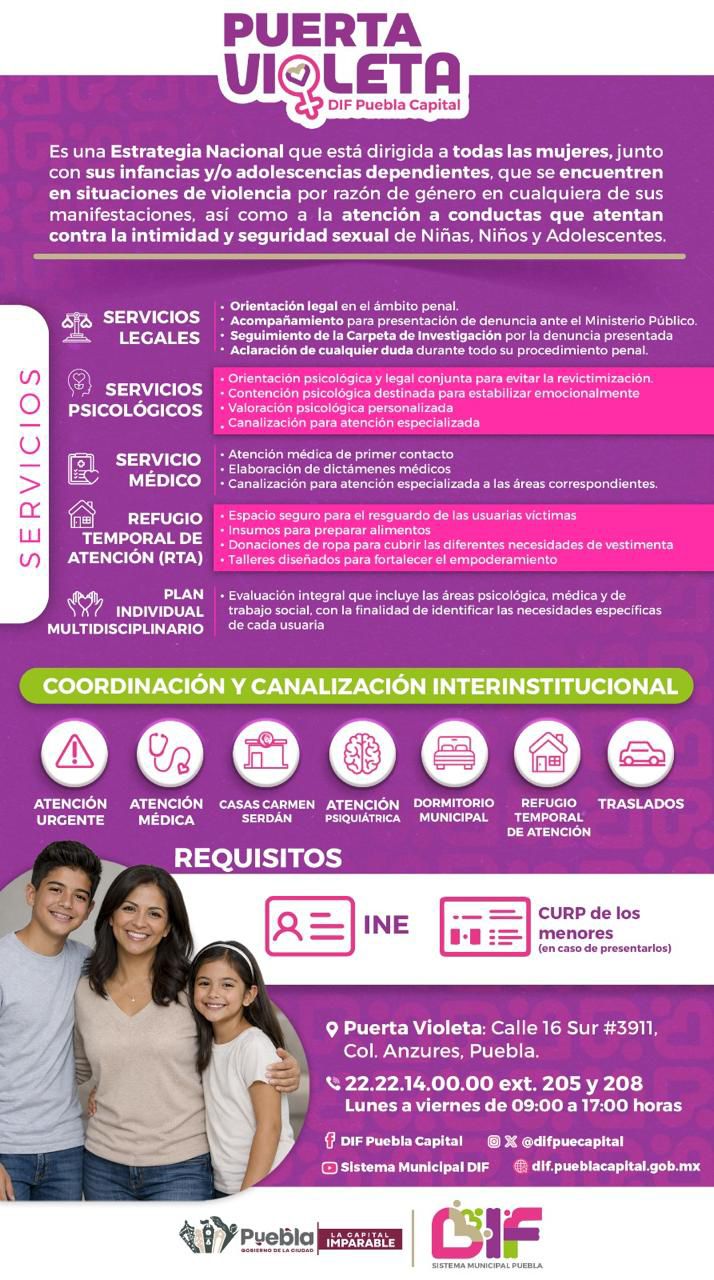 Las personas que requieran apoyo o conozcan algún caso de violencia pueden acudir a la Dirección de Protección de Derechos, ubicada en 16 Sur 3911, colonia Anzures, o comunicarse al 222 214 00 00 extensiones 225 y 226, en un horario de lunes a viernes de 9:00 a 17:00 horas. Asimismo, está disponible el número de WhatsApp 222 215 22 70, que brinda atención las 24 horas del día, los 365 días del año.