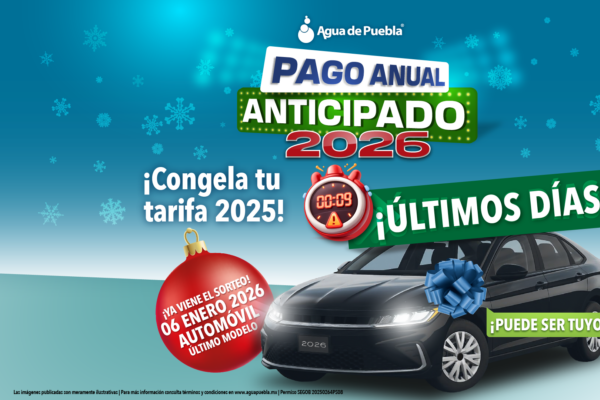 Agua de Puebla invita a todos los usuarios domésticos a aprovechar la última oportunidad, este miércoles el 31 de diciembre, de realizar su Pago Anual Anticipado, congelar su tarifa 2025 durante todo el año 2026 y participar en el primer sorteo de un auto último modelo que se llevará a cabo el próximo 6 de enero, Día de Reyes.