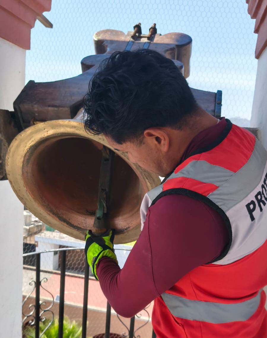 Durante los recorridos, se verificaron los amarres de los badajos y las estructuras de las campanas; además, se brindaron recomendaciones de seguridad a las y los campaneros, con el objetivo de descartar riesgos y garantizar un evento seguro para todas y todos.