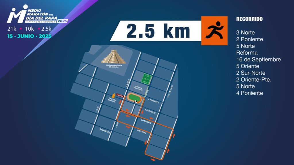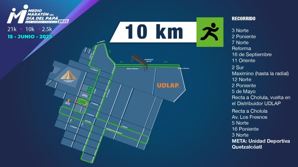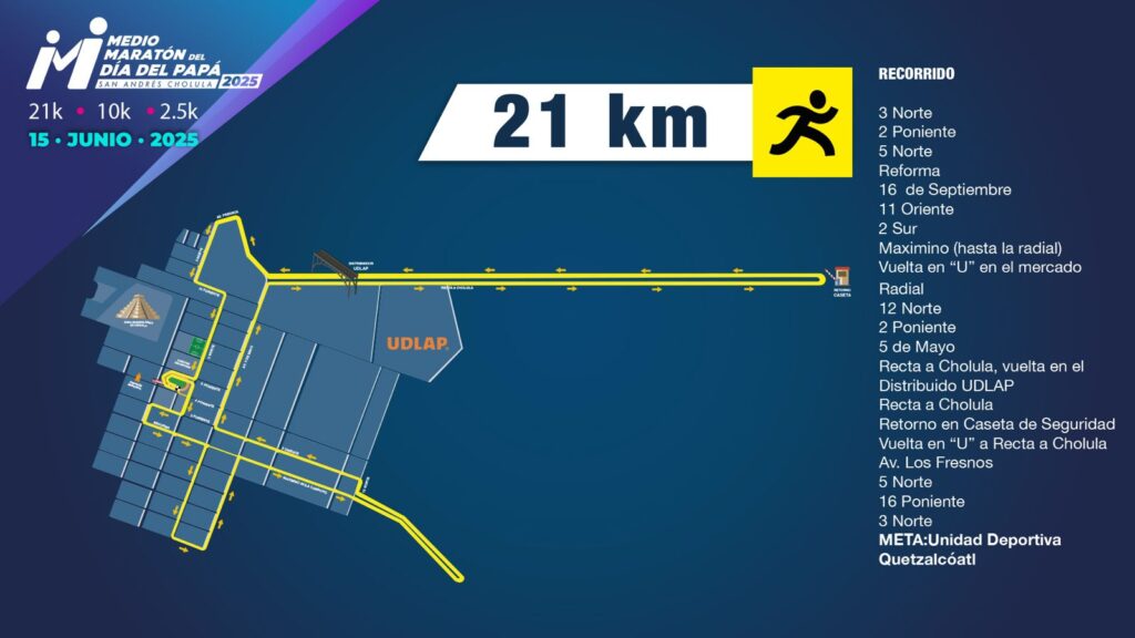 La salida y la meta del Maratón se ubicarán en el Complejo Deportivo Quetzalcóatl, para arrancar por la siguiente ruta: Calle 3 norte, 2 poniente, 8 sur, Av. Reforma, 16 de septiembre, 15 oriente, 2 sur, Maximino Ávila Camacho llegando a la radial se tomará la Av. Camino Real (mercado) vuelta en “U” en el primer retorno y regresar a calle 12 norte, 2 oriente, 5 de mayo, recta sentido Cholula-Puebla, retornando en caseta de seguridad La Paz, vuelta en “U” recta Puebla a Cholula, Avenida los Fresnos (vía del tren), calle 10 Norte, 16 Pte., 3 Norte.