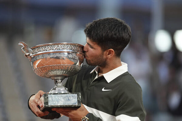 Carlos Alcaraz remontó tras perder los dos primeros sets y salvó tres puntos de partido para vencer el domingo 4-6, 6-7 (4), 6-4, 7-6 (3), 7-6 (10-2) a Jannik Sinner y revalidar su título del Abierto de Francia.