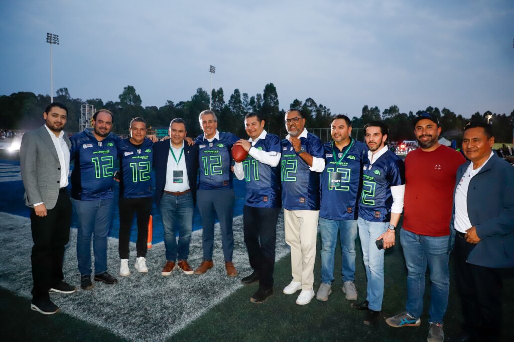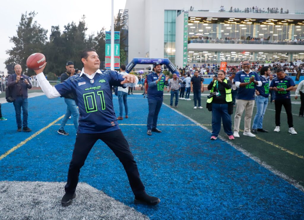 El recibimiento fue especialmente emotivo: niñas y niños apasionados por el fútbol americano entregaron al mandatario un balón con el que, minutos después, protagonizó lanzamientos de calentamiento junto a José Chedraui sobre el emparrillado. Alejandro Armenta también repartió gorras del equipo local como gesto simbólico para fomentar el entusiasmo por este deporte en las nuevas generaciones.