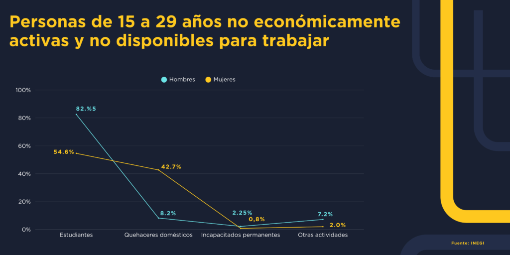 Por otro lado, una parte considerable de la población joven permanece fuera del mercado laboral. La mayoría de estos jóvenes que no son económicamente activos cuenta con estudios de secundaria o de educación media superior, pero no participa en actividades productivas. Entre ellos, la principal ocupación está vinculada a la educación —es decir, siguen estudiando— o a los quehaceres domésticos. Al desglosar por género, se observa que la mayoría de los hombres en esta condición afirma no tener disponibilidad para trabajar, mientras que en el caso de las mujeres, casi el 70% señala estar soltera, un rasgo que se repite en el 98% de los varones.