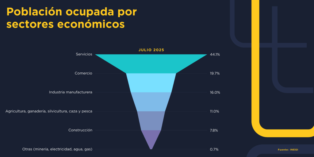 La distribución sectorial de la población ocupada mostró que el 44,1% se emplea en servicios, 19,7% en comercio, 16% en manufacturas, 11% en actividades agropecuarias y 7,8% en construcción. Las actividades como minería, electricidad, agua y suministro de gas representaron apenas el 0,7%, mientras que otro 0,7% no especificó su actividad.