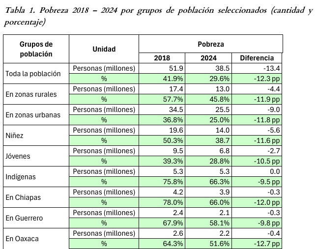 La reducción de la pobreza de 51.9 millones a 38.5 millones de personas entre 2018 y 2024 y de 42% a 30% de la población, proviene casi en su totalidad de la dimensión económica. La baja en la pobreza es resultado del incremento del ingreso.