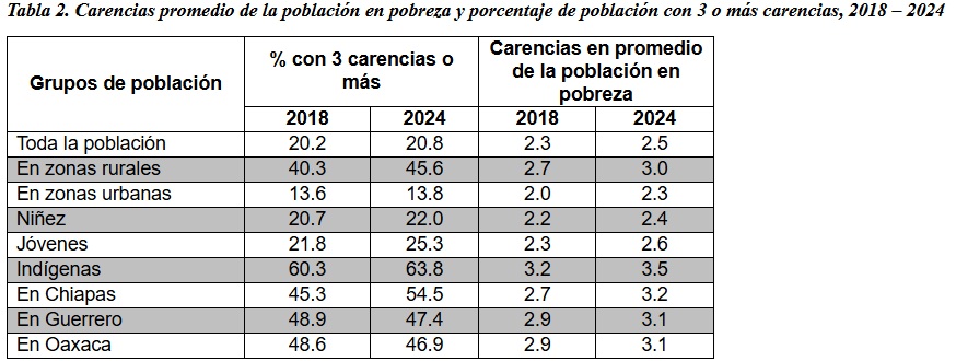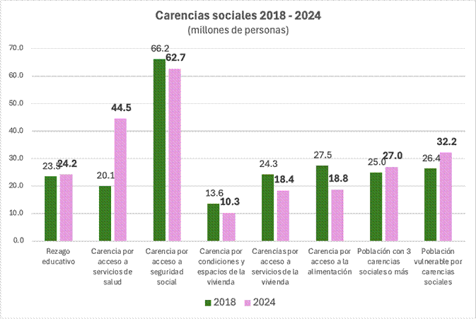 En contraste, la política social queda a deber; en la dimensión social no hay mejoras sustantivas. La población vulnerable por carencias sociales o más aumenta de 32.7 a 41.9 millones de personas, mientras en porcentaje sube de 26% a 32%. Los hogares en pobreza tienen en 2024 un poco más carencias en promedio (2.5) que en 2018 (2.3).
