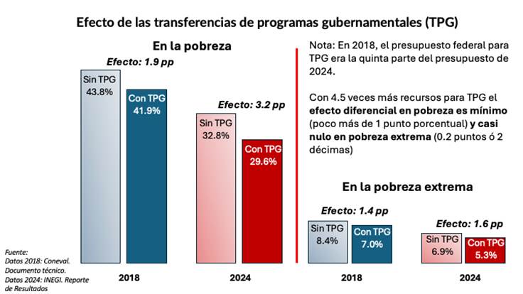 - Los programas gubernamentales de transferencias monetarias multiplicaron por 4.5 su presupuesto, pero su efecto en la pobreza es mínimo y en la pobreza extrema es nulo, pues excluyen al 65% de los hogares de menor ingreso.