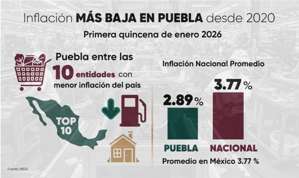 De acuerdo con el más reciente registro del Instituto Nacional de Estadística y Geografía (INEGI), la inflación en el estado de Puebla durante la primera quincena de enero de 2026 se ubicó en 2.89 por ciento, cifra inferior al promedio nacional y reflejo de un control relativo en los niveles de precios que enfrentan los hogares poblanos.