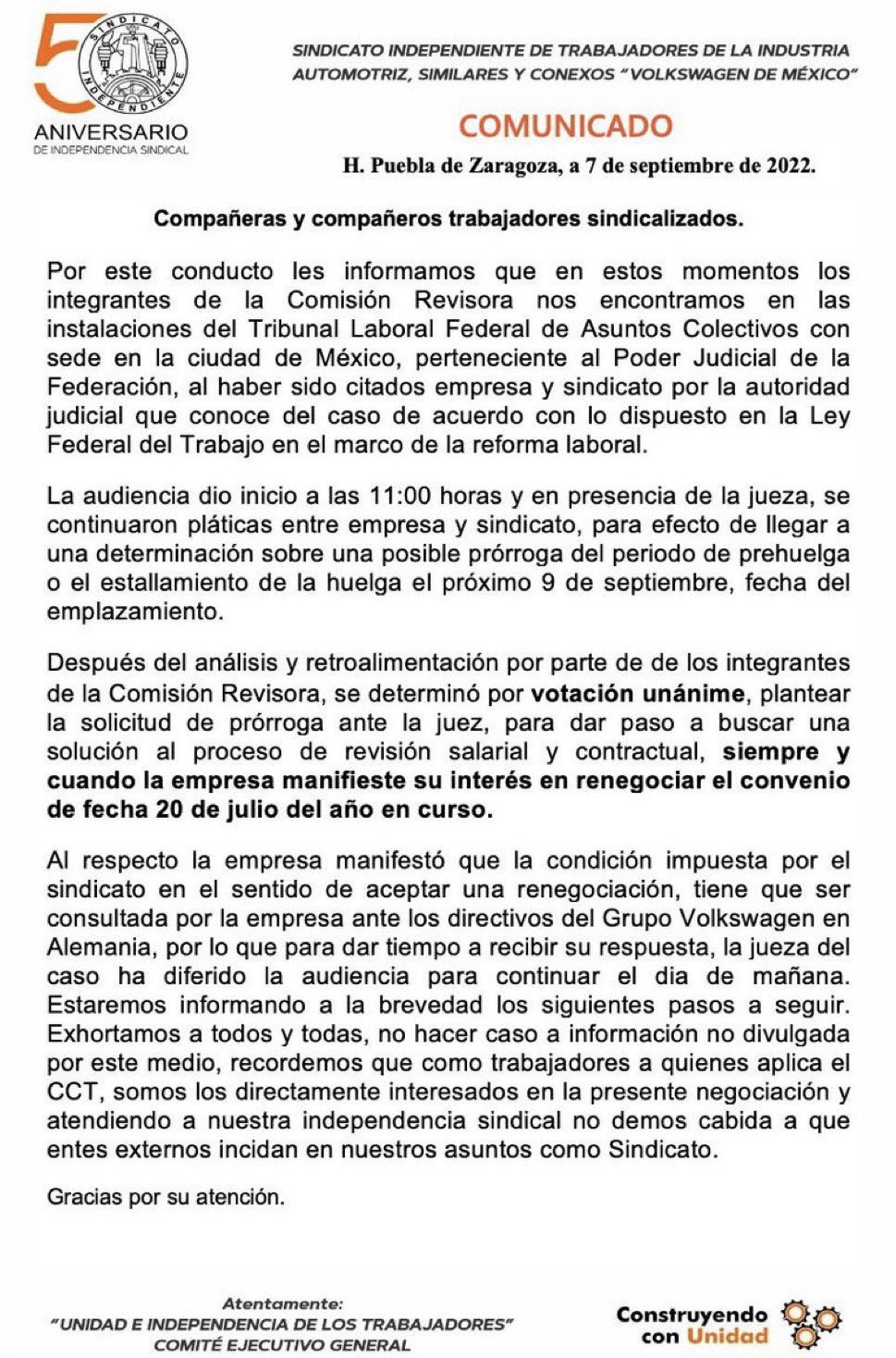 “Después de un análisis y retroalimentación por parte de los integrantes de la Comisión Revisora, se determinó por votación unánime, plantear la solicitud de prórroga ante la juez, para dar paso a buscar una solución al proceso de revisión salarial y contractual, siempre y cuando la empresa manifieste su interés en renegociar”.