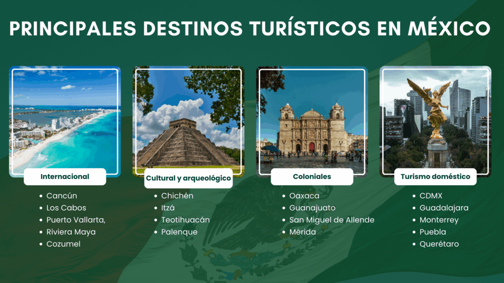 Los destinos preferidos por los turistas internacionales siguen siendo emblemáticos. Cancún se mantiene como referente del turismo de sol y playa, seguido por la Riviera Maya, Los Cabos y Puerto Vallarta, que concentran gran parte de la oferta de lujo y servicios de categoría internacional. Paralelamente, los sitios arqueológicos como Chichén Itzá, Teotihuacán y Palenque, junto con ciudades coloniales como Oaxaca, Guanajuato, San Miguel de Allende y Mérida, refuerzan la relevancia del turismo cultural. Por su parte, el turismo doméstico continúa siendo decisivo, con mexicanos viajando hacia pueblos mágicos, rutas gastronómicas y ciudades como Ciudad de México, Guadalajara, Monterrey y Puebla, que siguen siendo polos de atracción interna.