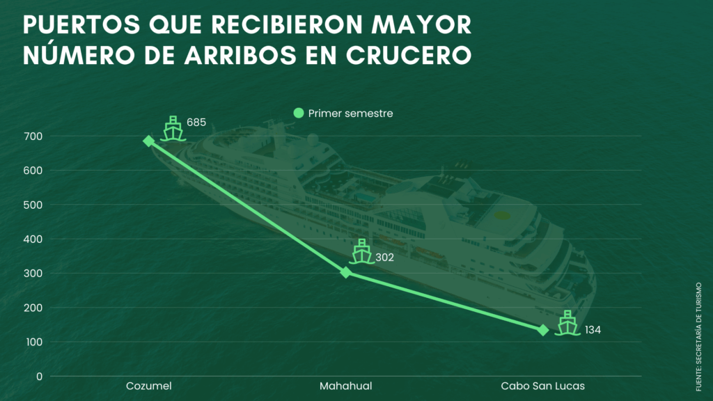 Otro componente destacado del repunte turístico es el auge de los cruceros. Entre enero y junio arribaron 5.7 millones de pasajeros a distintos puertos del país, lo que representó un incremento del 9.6% frente a 2024 y del 20.8% respecto a 2019. Las divisas generadas por esta vía ascendieron a 484 millones de dólares, un alza del 11.3% con respecto al año anterior. Los puertos más concurridos fueron Cozumel y Mahahual, en Quintana Roo, con 685 y 302 arribos respectivamente, seguidos por Ensenada, Cabo San Lucas y Puerto Vallarta.