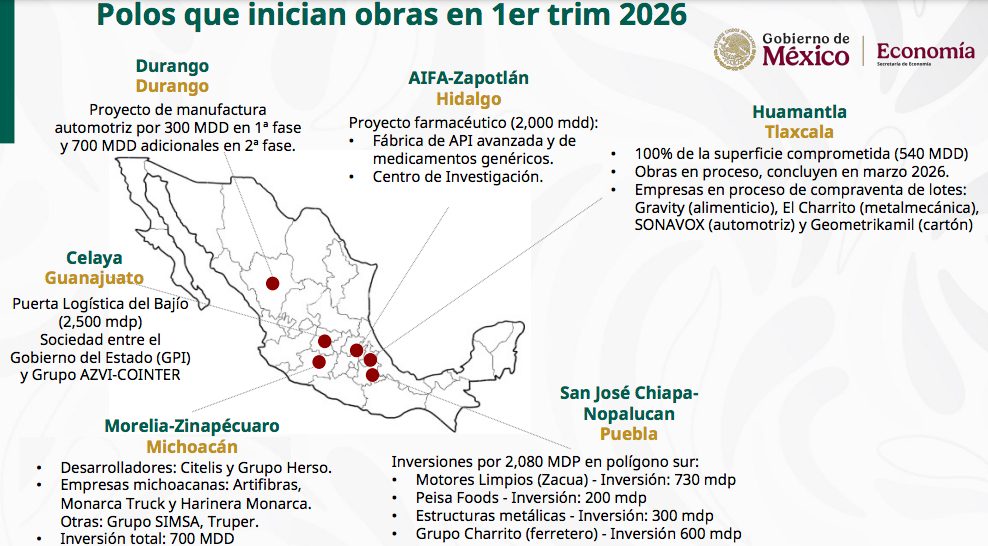 El titular de la Secretaría de Economía del Gobierno de México, Marcelo Ebrad Casaubón informó que son nueve las empresas que comenzarán a construir durante el primer trimestre del 2026 en los Polos de Desarrollo Económico para el Bienestar ubicados en los polígonos de Huamantla, Tlaxcala y San José Chiapa-Nopalucan, en Puebla.