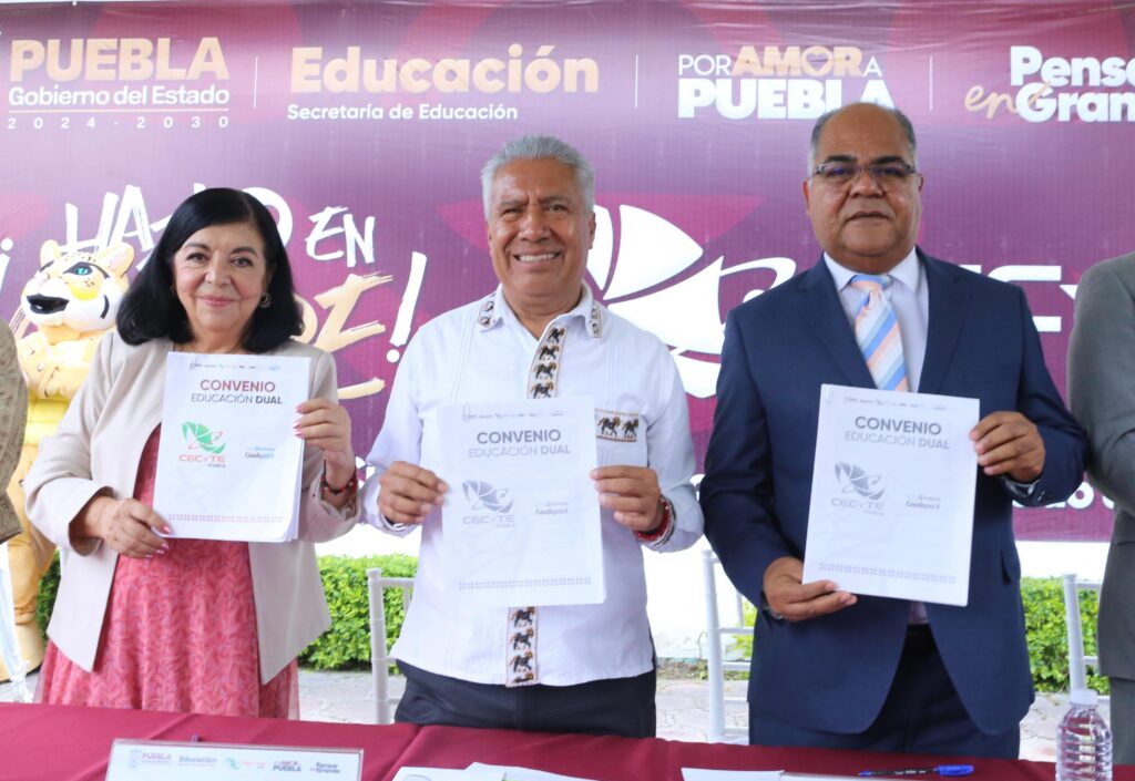 Con el objetivo de fortalecer la educación e impulsar la formación académica y profesional de las y los estudiantes, el Colegio de Estudios Científicos y Tecnológicos del Estado de Puebla (CECyTE), llevó a cabo la Firma de Convenio Dual con 19 empresas, ante la presencia del coordinador nacional de los CECyTEs, Iván Flores Rodríguez.