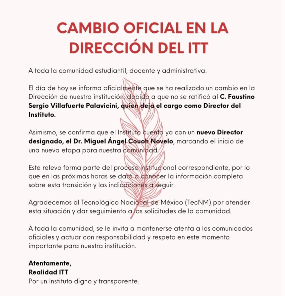 Desde las primeras horas posteriores al anuncio, alumnos han manifestado inconformidad, luego de que comenzaran a circular noticias y antecedentes del paso del Dr. Couoh Novelo por el Tecnológico de Tlaxcala, donde —según versiones difundidas— se habrían registrado situaciones similares a las que hoy preocupan a la comunidad estudiantil de Tehuacán.