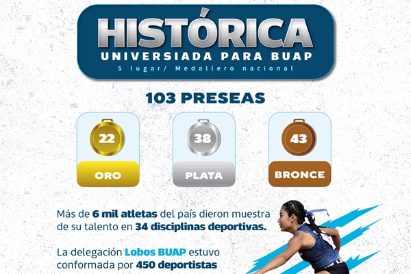 La Máxima Casa de Estudios en Puebla participó en 31 de las 34 disciplinas, en las cuales ganó 103 preseas: 22 de oro, 38 de plata y 43 de bronce. En algunos deportes en los que compitió por primera vez logró buenos resultados. Tal es el caso de powerlifting, e.sports y natación. En el primero, 10 medallas: tres de oro, cuatro de plata y tres de bronce; en el segundo, seis: dos de oro, dos de plata y dos de bronce; y en el tercero, seis: tres de plata y tres de bronce.