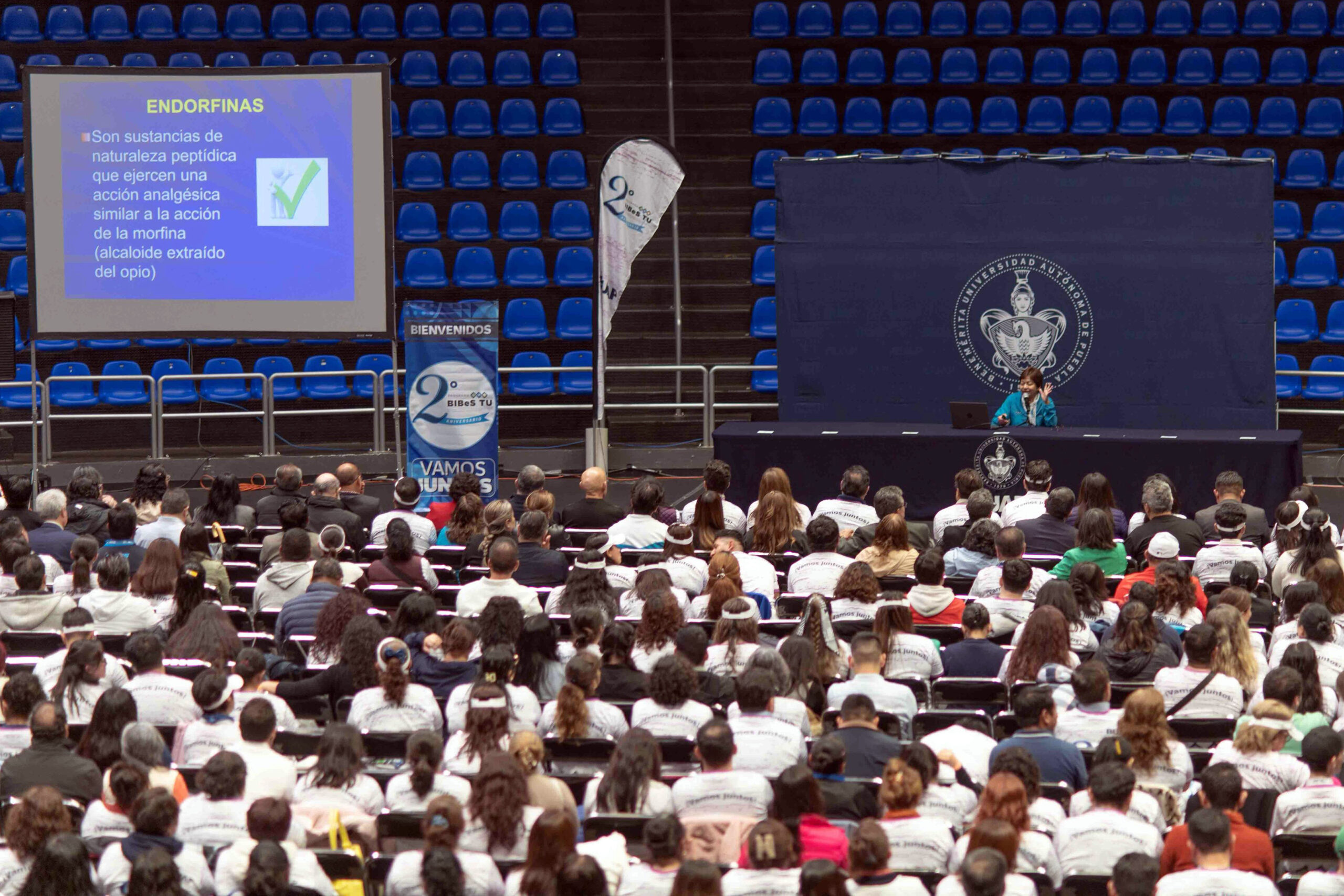 La felicidad es un estado bioquímico que todos podemos alcanzar y las endorfinas nos la proporcionan. Por ello, la Rectora de la BUAP Lilia Cedillo invitó a los asistentes reunidos en la Arena BUAP a practicar ejercicio, evocar situaciones placenteras, respirar y ayudar al prójimo, puesto que estas acciones generan endorfinas y éstas un estado de felicidad.