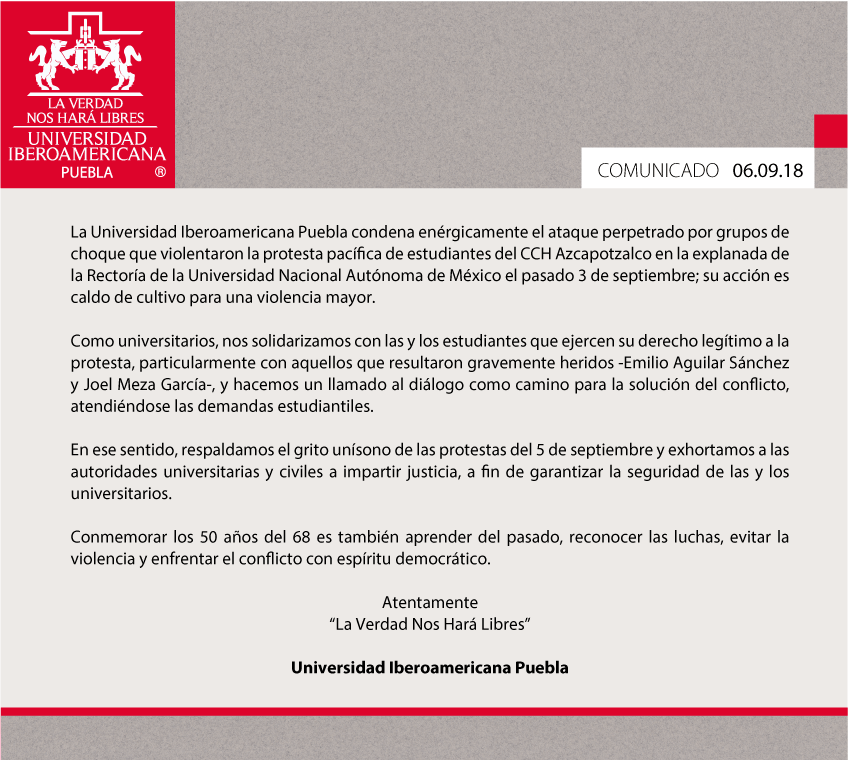 La Universidad Iberoamericana Puebla manifiesta su posición ante los hechos ocurridos el pasado 3 de septiembre en las instalaciones del CCH Azcapotzalco
