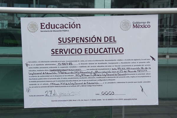 La Secretaría de Educación Pública (SEP) del Gobierno Federal colocó sellos de «Suspensión de Servicios Educativos» al exterior de las instalaciones de la Universidad Cuauhtémoc, ubicada en la calle 15 Poniente 3515, en la colonia Belisario Domínguez. Cabe mencionar que los sellos tienen fecha del pasado 27 de junio.