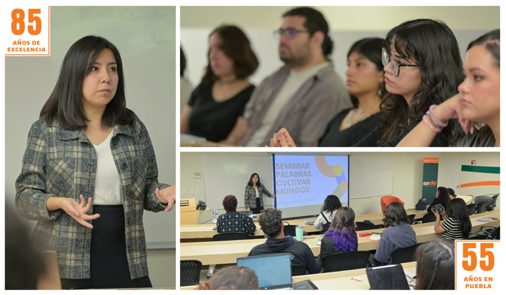 Posteriormente, la Mtra. Olivia Nicté Toxqui Martínez, destacada egresada de la Licenciatura en Literatura de la UDLAP, presentó su proyecto “Sembrar Palabras y Cultivar mundos”, realizado el año pasado en el CBTIS 142. En este proyecto, Nicté identificó rezagos en comprensión lectora y redacción tras la pandemia, y diseñó un “aula viva” que convirtió la riqueza natural del plantel en un recurso pedagógico.