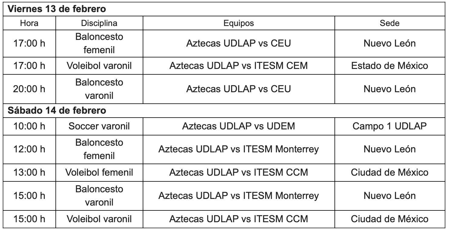 Mientras esperamos algunos meses para el arranque de la temporada de futbol americano, los otros equipos representativos deportivos Aztecas de la UDLAP, se encuentran en la disputa de diferentes ligas y este es el calendario de juegos de este fin de semana: