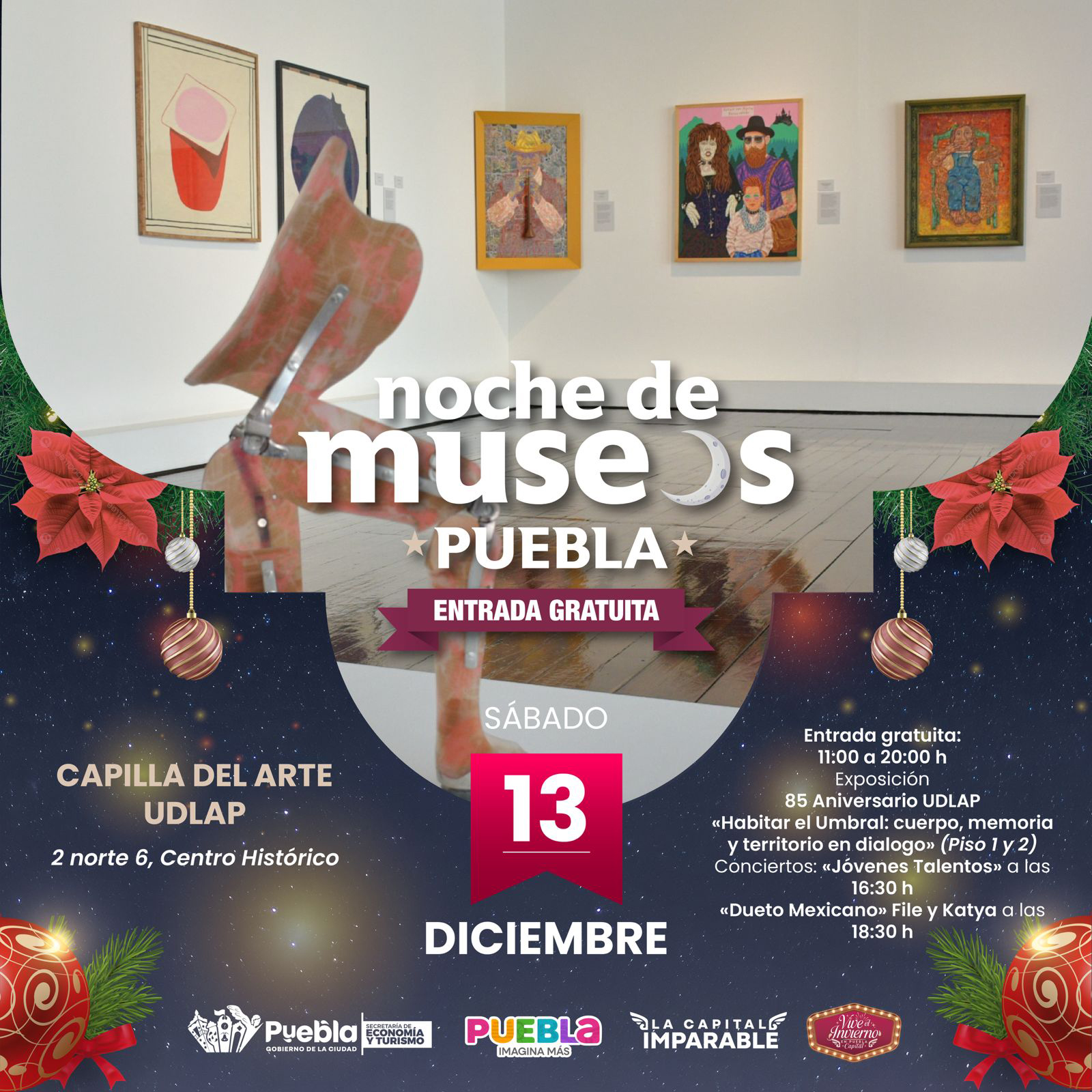 La Capilla del Arte, espacio cultural de la Universidad de las Américas Puebla (UDLAP), ubicada en el centro histórico de la ciudad de Puebla, se suma a las actividades especiales realizadas en el marco de la Noche de Museos que se celebrará el próximo sábado 13 de diciembre. Las personas interesadas en visitar este recinto cultural podrán hacerlo en un horario de 11:00 a 20:00 horas, en el que podrán observar la estructura francesa que alberga la galería, recorrer la nueva exposición colectiva que ocupa los dos pisos del emblemático edificio, y ser parte de distintas actividades.
