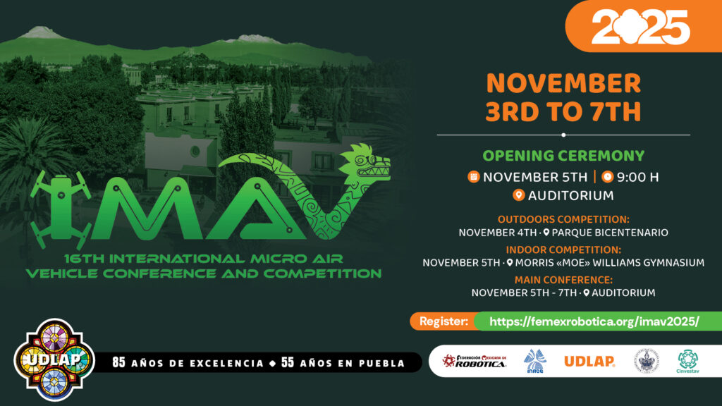 Bajo el compromiso de impulsar la ciencia, tecnología, ingeniería y matemáticas (áreas STEM), la Universidad de las Américas Puebla (UDLAP) se convierte del 3 al 7 de noviembre, en el epicentro de la innovación tecnológica en el ámbito de los vehículos aéreos no tripulados de pequeña escala, al ser sede del International Micro Air Vehicle Conference and Competitions (IMAV), evento que fusiona la emoción de las competencias de drones con mentes brillantes del ámbito académico, industrial y estudiantil, para explorar los avances más recientes en autonomía aérea y robótica inteligente.