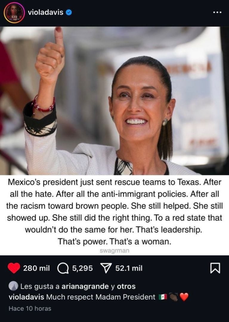 Este mensaje fue apoyado por la actriz y cantante, Ariana Grande, quien le dio “me gusta” a la publicación de Viola Davis, con lo cual queda de manifiesto su reconocimiento a Claudia Sheinbaum.
