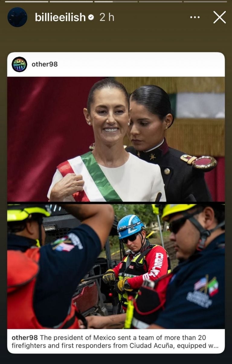 En la publicación compartida por Billie Eilish se observa a Claudia Sheinbaum durante el día de su llegada al poder, así como una fotografía de elementos de rescate en Texas.