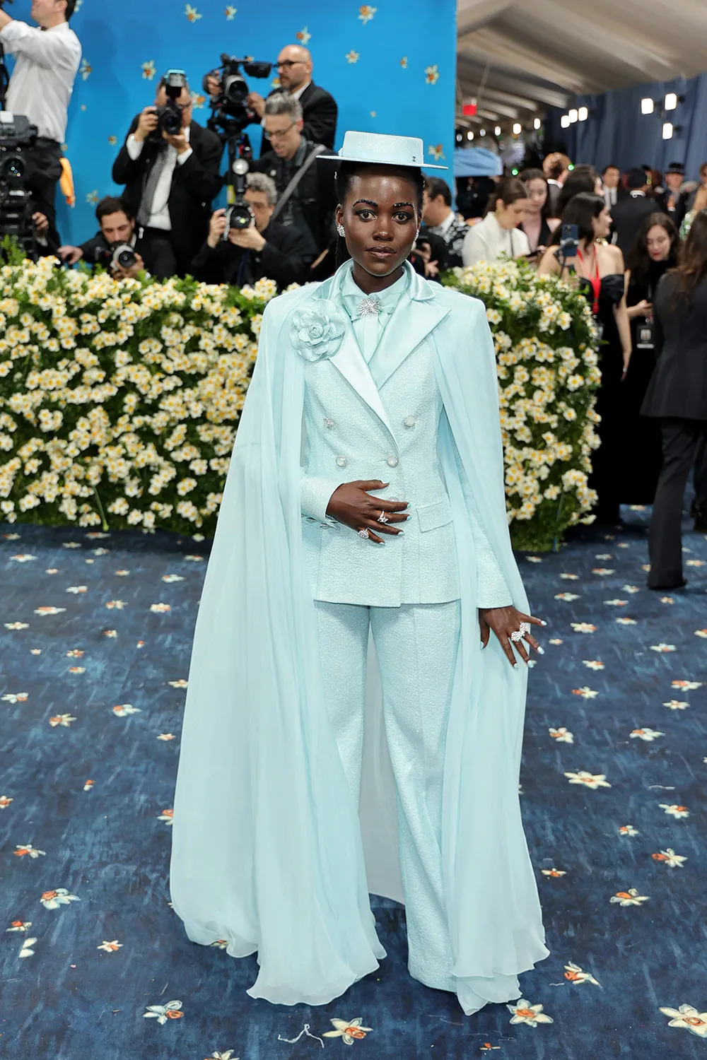 Chanel, casa fundada sobre la idea de incorporar elementos de la moda masculina para liberar a las mujeres de los corsés del siglo XX, potenció esa idea con los looks creados para estrellas como Dua Lipa, Jennie de Blackpink y Lupita Nyong’o. Esta última eligió un conjunto completo a medida: una chaqueta de lana lurex aguamarina con cuello de satén, pantalones a juego, blusa de satén con lazo y capa de gasa aguamarina. El look se inspiró en un diseño de Karl Lagerfeld de la colección de alta costura otoño/invierno 2015-16. Completaron el conjunto joyas de diamantes, un broche de camelia sobredimensionado, sombrero y zapatos, todos de Chanel.