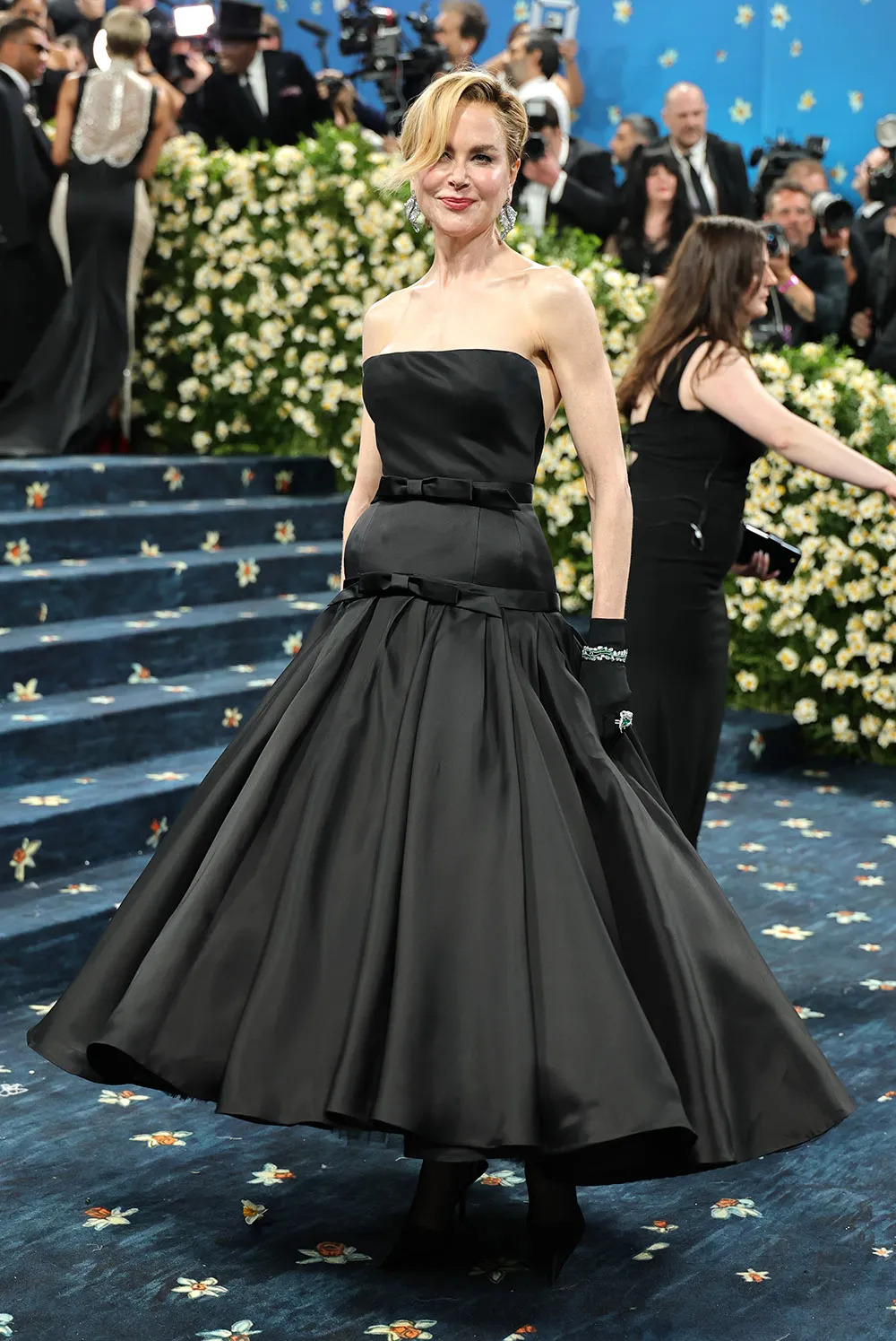 Estrenando un nuevo corte pixie, Nicole Kidman solo hizo un guiño al tema de la noche a través del color negro de su vestido, que aun así fue impactante. Una reinterpretación personalizada de un diseño de Cristóbal Balenciaga de 1952, su vestido de corsé de organza de seda incluía múltiples capas de enaguas esculpidas con lazos de satén en la cintura y las caderas. Kidman completó su look con joyas de esmeralda y diamantes de alta gama de Cindy Chao, así como guantes hasta la muñeca y zapatos con correa al tobillo de Balenciaga.