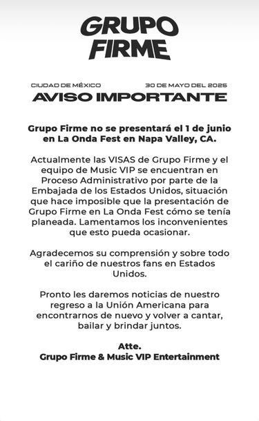 Pronto les daremos noticias de nuestro regreso a la Unión Americana para encontrarnos de nuevo y volver a cantar, bailar y brindar juntos», finaliza el comunicado firmado por Grupo Firme y Music VIP Entertainment.